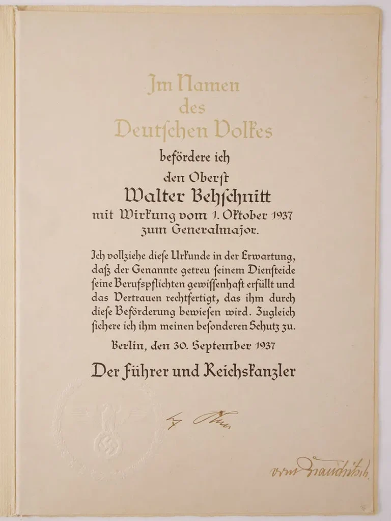 Hitler Signed General Officer Promotion 1937 DS