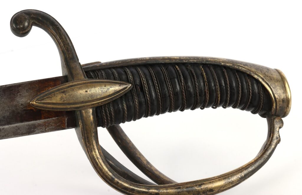 French AN XI light cavalry officer’s saber with scabbard, ca. 1803. Blade length 34.5 inches. Overall length 40.5 inches. Ricasso marked “I.S. & C.” Spine has rose mark of Solingen makers. Blade has talismanic engraved decoration. This lot has a reserve.