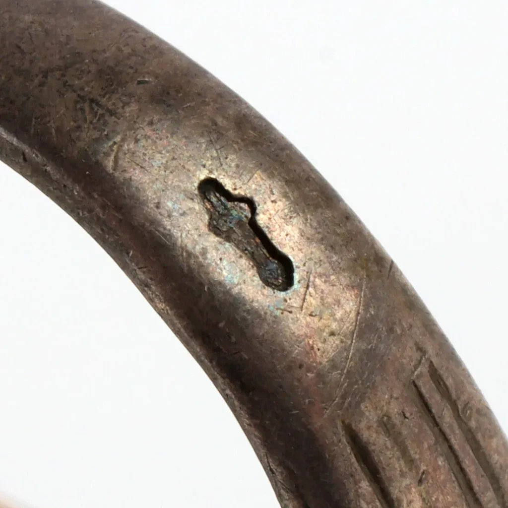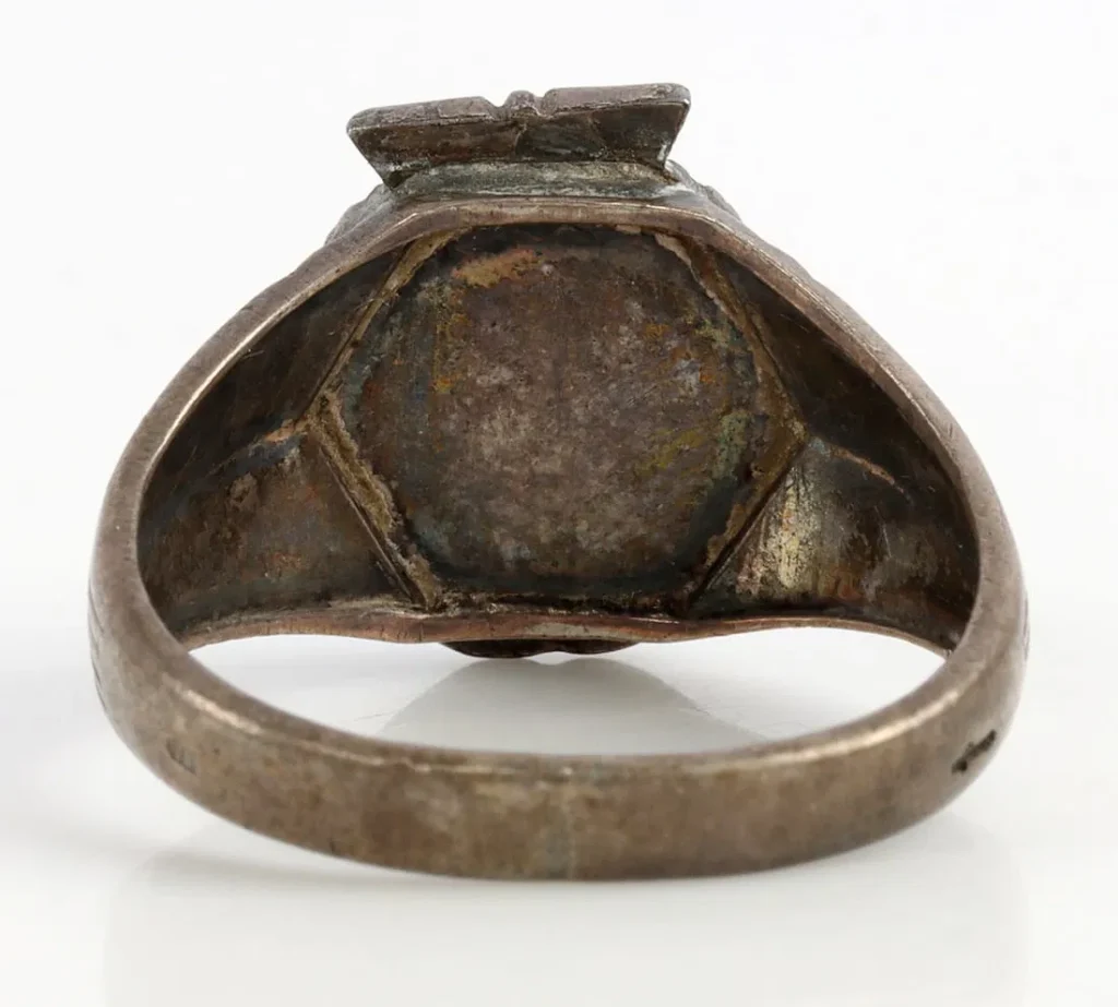 Silver ring with miniature Kriegsmarine Minesweeper War Badge, ca. 1941. Exterior stamped with Dutch silver hallmark, a single sword, indicating minimum .833 fineness. Size 8. Gross weight 5.8 grams. Fine condition.