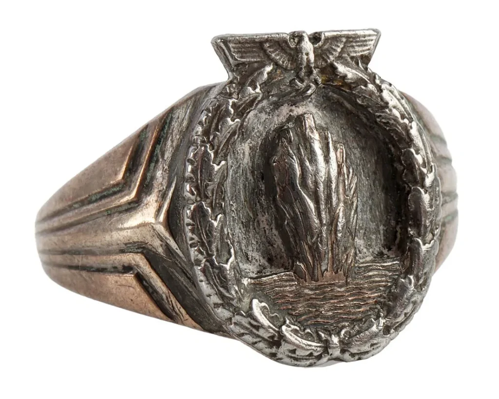 Silver ring with miniature Kriegsmarine Minesweeper War Badge, ca. 1941. Exterior stamped with Dutch silver hallmark, a single sword, indicating minimum .833 fineness. Size 8. Gross weight 5.8 grams. Fine condition.
