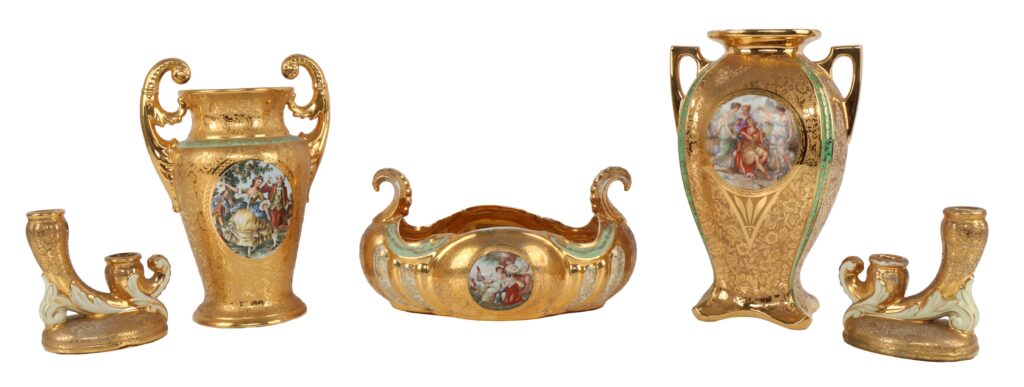 Tableware set made by La France. Each piece has 24K gold paint. Set includes two vases, two candles, and a dish. One of the vases is stamped “La France 24K.” The other pieces have felt covering the bottoms. Largest piece is 12x8x6 inches.